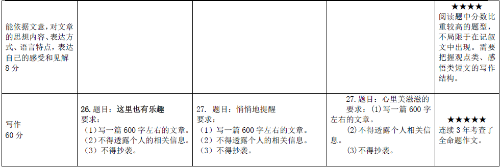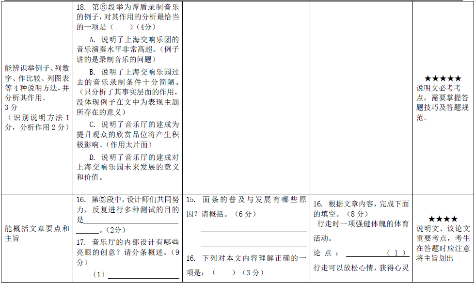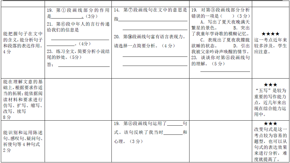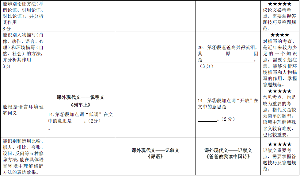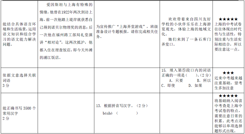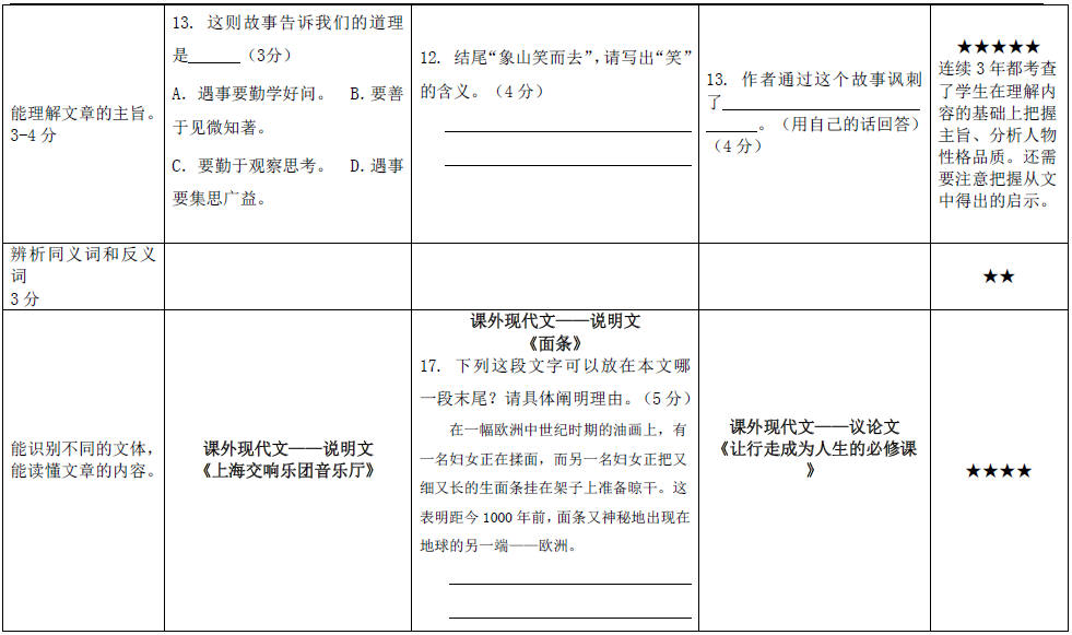2、由于教材及考试的变化,因此本表只对近3年的上海语文中考真题进行横向比较。