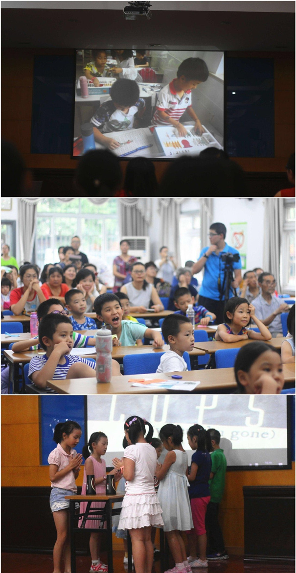 结业典礼上,思源老师与志愿者、小朋友、孩子家长轮番上场表演才艺,小品、歌舞、互动游戏。精彩的演出博得台下观众阵阵掌声。孩子们还与家长、教师志愿者们通过PPT共同回顾在暑托班的点滴时光,孩子看着自己在暑托班留下的“美照”,都不禁大笑起来。精彩有趣的课程让孩子的暑假充满欢乐,学生家长们看着照片也是欣慰不已。
