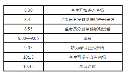 3.英语考试时间为上午9:00至10:45,其中9:00至9:05为试音时间,入场考试、分发试卷及听力等具体时间见下表。