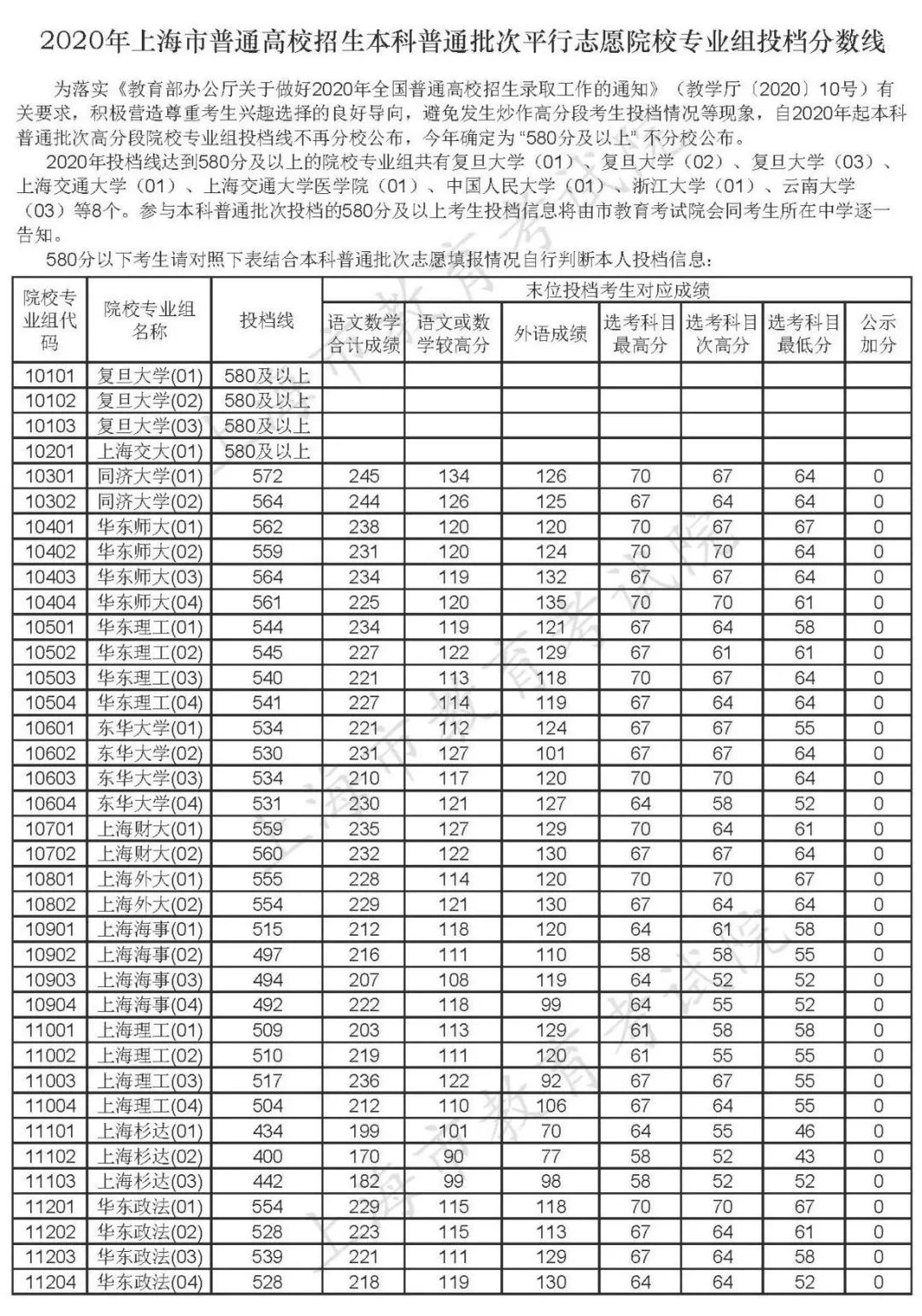 @高三考生们,2020年上海市普通高校招生本科普通批次平行志愿院校专业组投档分数线公布!速戳!