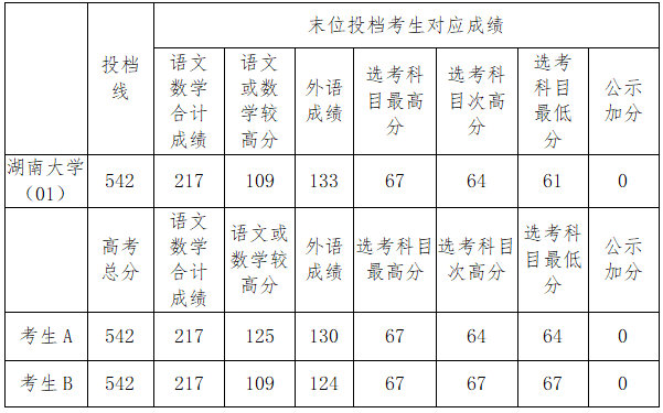 若考生成绩与投档线相同,如考生A、考生B两人的高考总分均为542分,与所填报的湖南大学(01)[投档线542分]相同,且两人填写在湖南大学(01)之前的院校专业组志愿投档线均高于542分,则这时候就要通过末位投档考生对应成绩来进行判断: