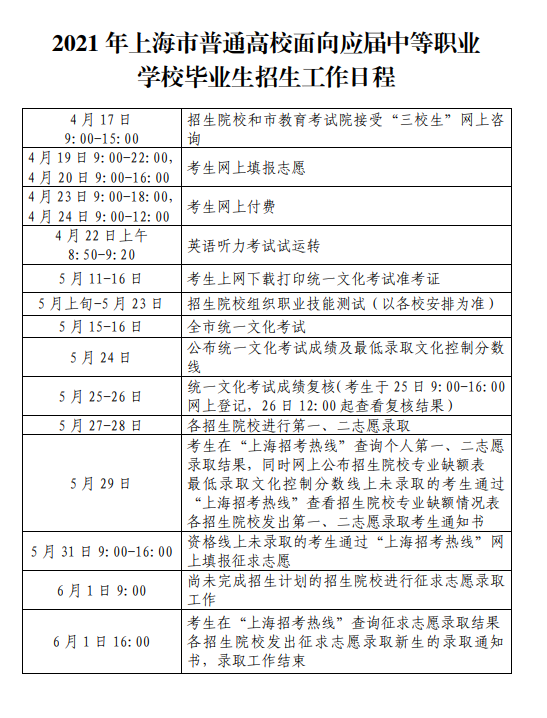 上海市教委昨天发布《关于做好2021年上海市普通高校面向应届中等职业学校毕业生招生工作的通知》(点这里了解),今天,上海市教育考试院发布了《2021年上海市普通高校面向应届中等职业学校毕业生招生工作实施办法》。今年三校生高考志愿填报时间为4月19日-20日,详细招生日程和政策要点见下文: