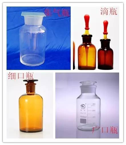 细口瓶(有棕色和无色之分,均带磨口的玻璃塞)、广口瓶(均为无色,带有配套的磨口玻璃塞)、滴瓶(有棕色和无色之分,均有配套的胶头滴管)、固体药品瓶(均为棕色,内有软塑塞,外有螺口硬塑盖)等。