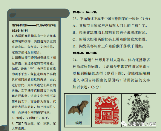 某???ldquo;中国传统文化”选修课,本节课要讲的内容是“中国吉祥图案”,讲课老师邀请你来上课,请你阅读链接材料并完成三个任务。