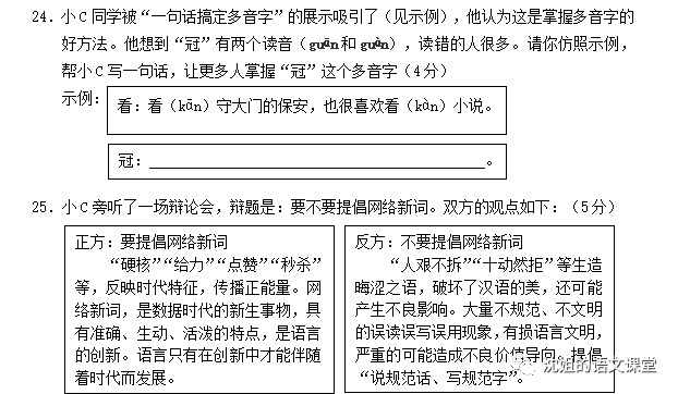 25.(5分)【要点及评分】(1)(2分)突出规范的重要:学习语言,首先是学习规范的语言,从而掌握语言的规范。(2)(2分)对语言创新的认识:语言创新要以语言规范为前提和基??;语言的创新要切合生活的实际,要符合时代的需要。(3)(1分)只有在规范使用汉语的框架内,语言创新才能获得丰富而健康的内涵。