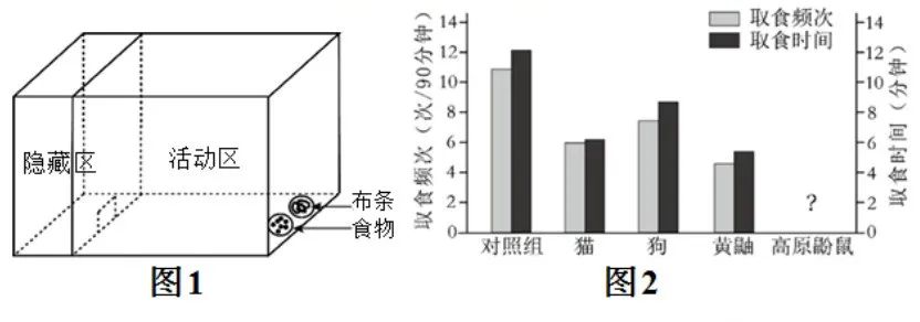 ②动物的分泌物具有独特的气味,研究人员用蒸馏水将高原鼠兔不同天敌的分泌物配制成浓度相同的溶液,分别浸透若干布条,并用______浸泡的布条作为对照。在每个观察箱活动区内放置相同的食物和浸透上述某一溶液的布条(图1所示)。由此可知,本实验的目的是探究_______信息对高原鼠兔出洞觅食行为的影响。